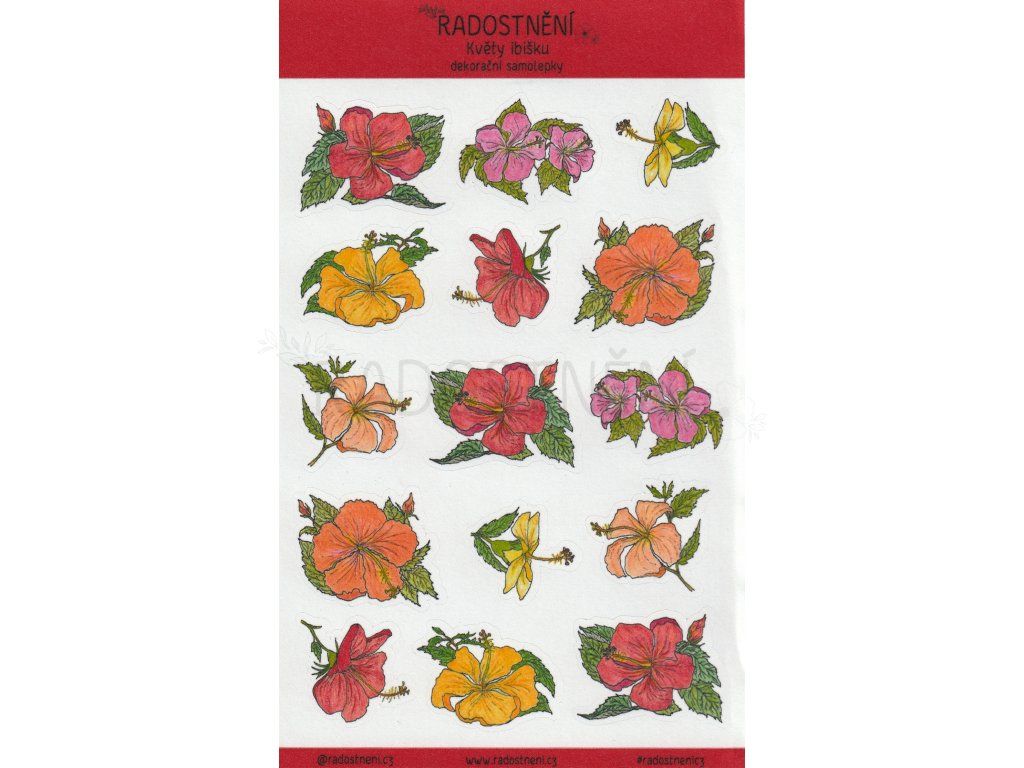 Samolepkový arch s ručně malovanými autorskými motivy květů ibišku. Dostupné v různých verzích archů.