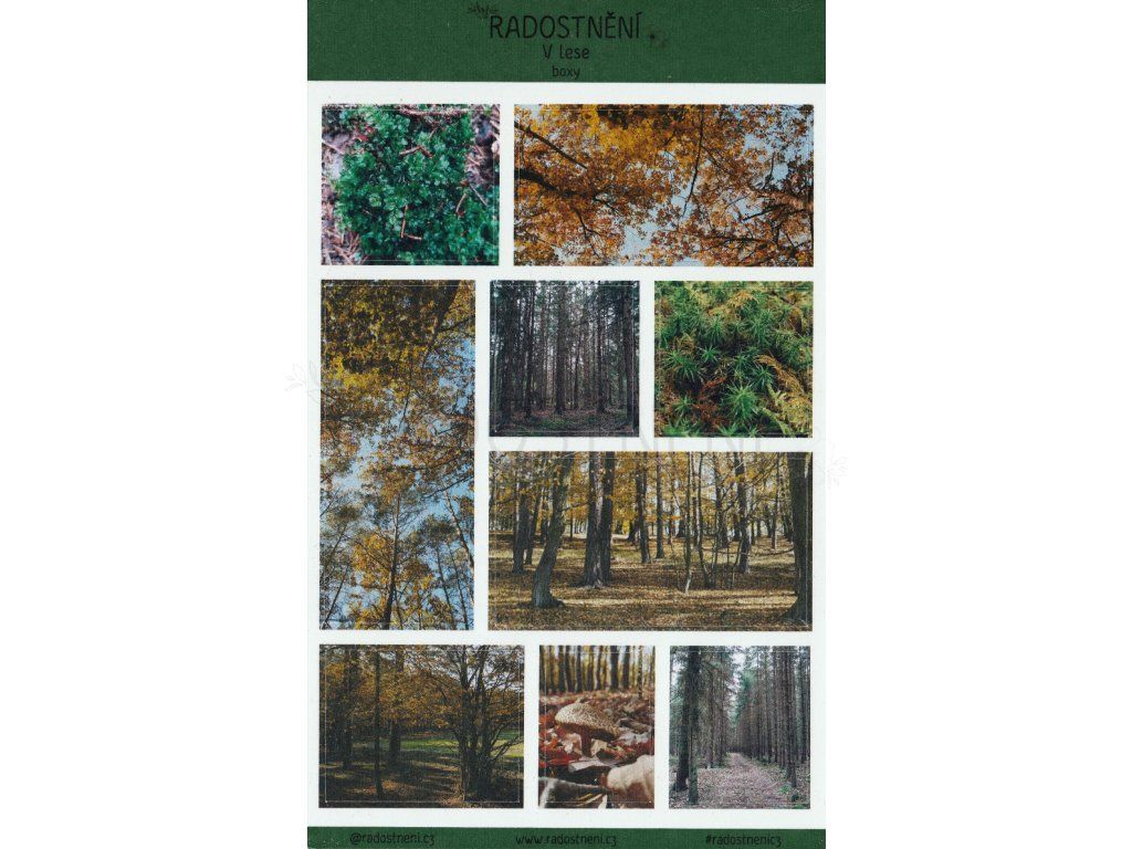 Samolepkový arch s autorskými fotografiemi lesa.