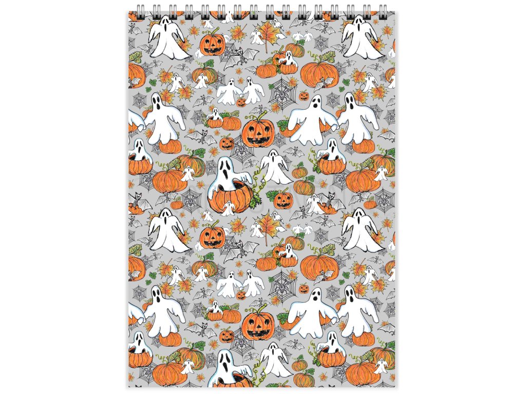 Kroužkový poznámkový blok s autorskými motivy Halloweenu - strašidly, dýněmi, pavučinami, netopýry...