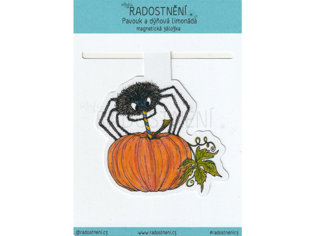 Nádherná magnetická záložka s autorským motivem pavouka s brčkem ponořeným do vynikající dýňové limonády.