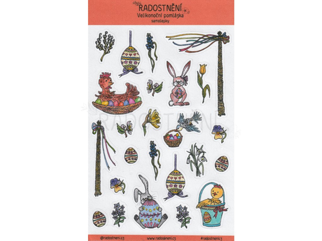 Samolepkový arch s ručně malovanými autorskými motivy Velikonoc a velikonoční pomlázky ve velké verzi archu.