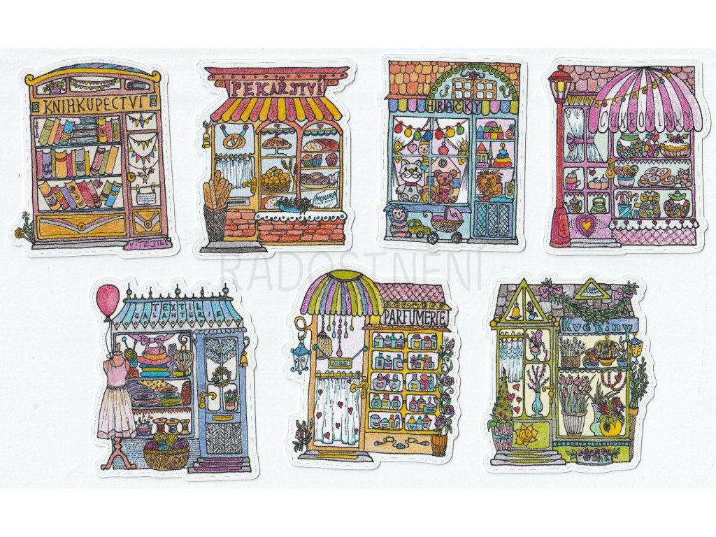 Sada velkých samolepek s motivy roztomilých obchůdků.