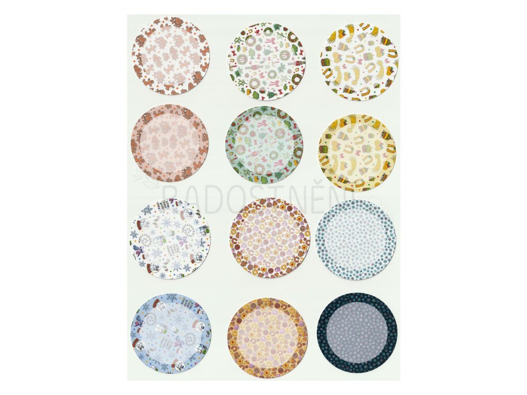 Sada obsahuje 12 ks samolepicích jmenovek s různými motivy. Dostupné ve třech variantách tvaru jmenovek - obdélníky, kolečka a rozetky / hvězdy.