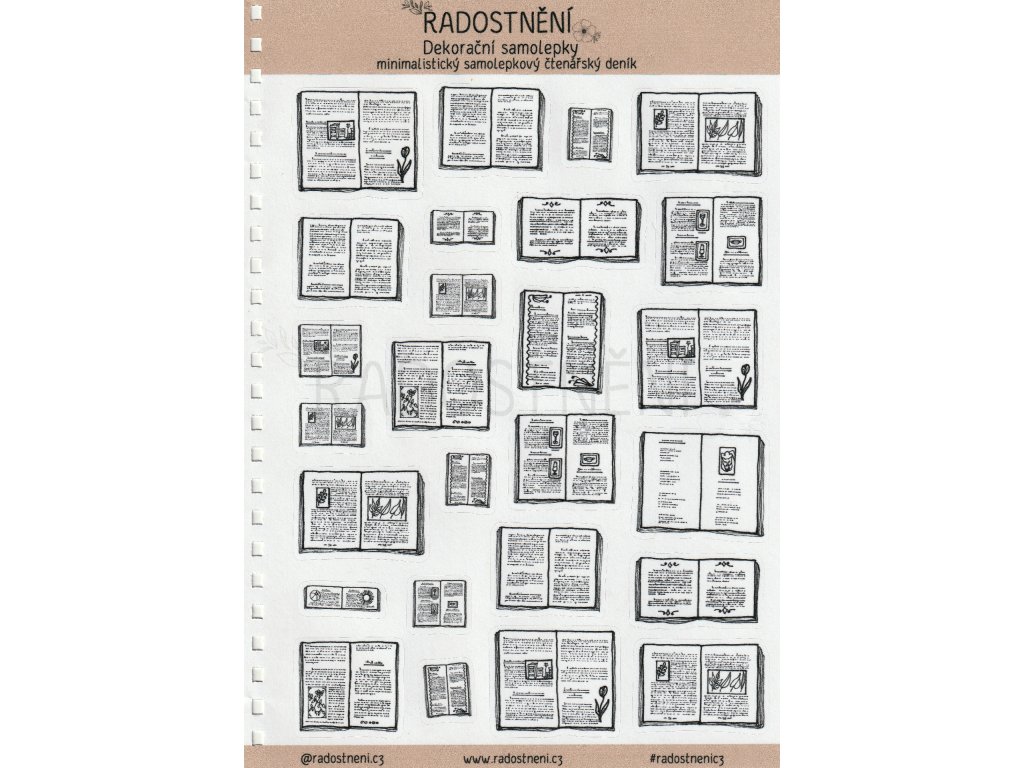 Samolepkový arch plný dekoračních samolepek s autorským motivem otevřených knih, připravený k vložení do našeho minimalistického čtenářského deníku.