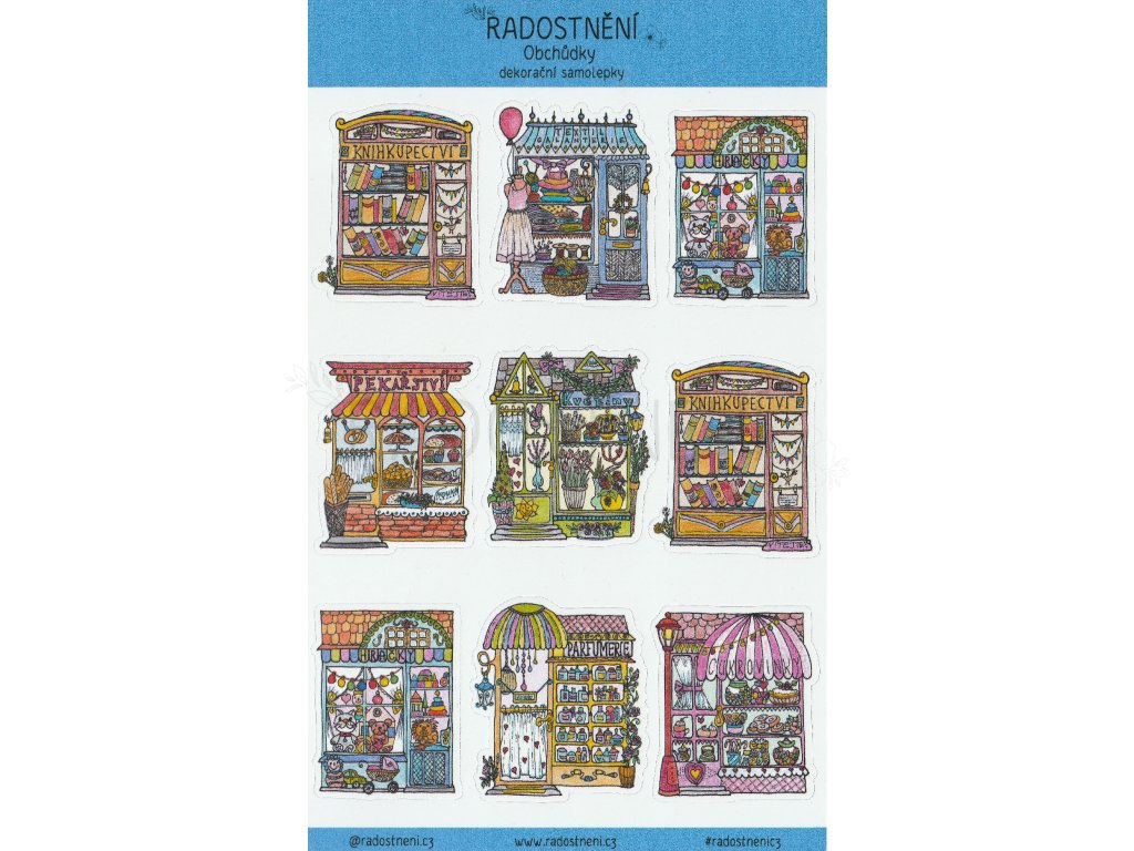 Samolepkový arch s ručně malovanými autorskými motivy roztomilých obchůdků. Dostupné v různých verzích archů.