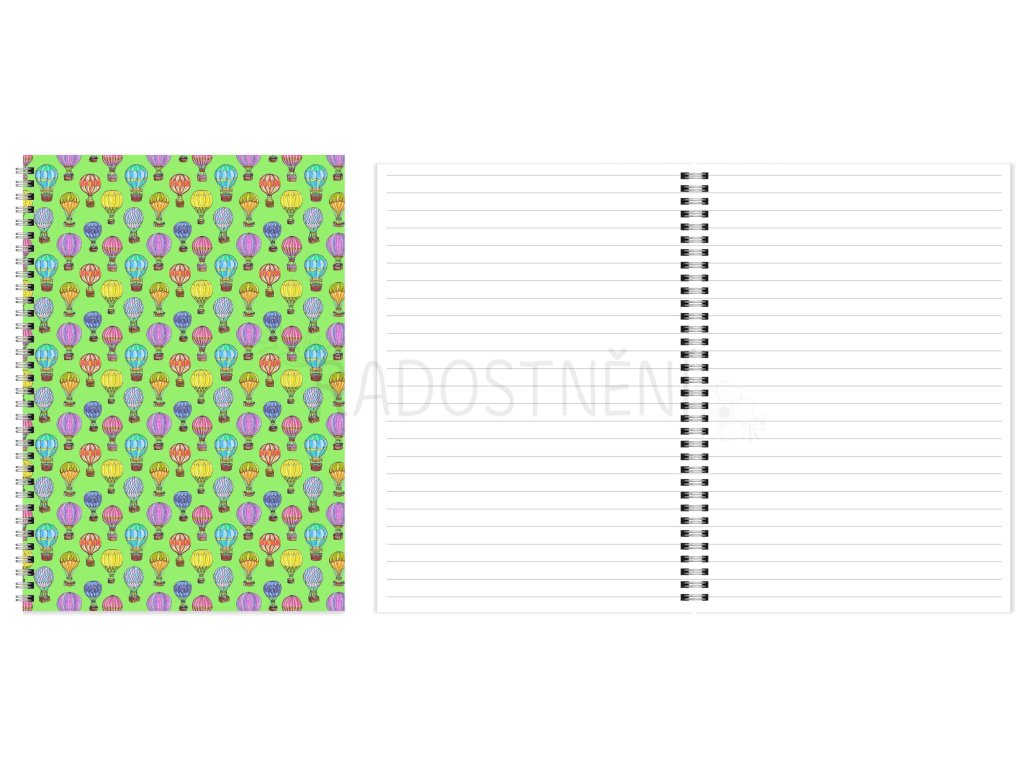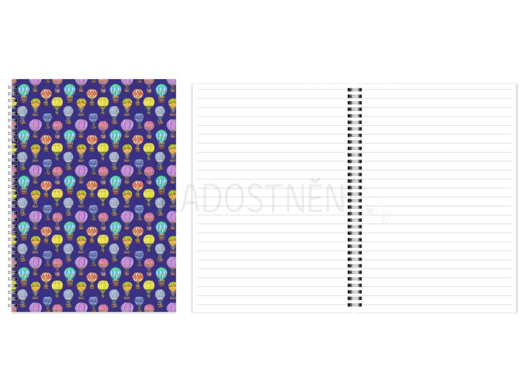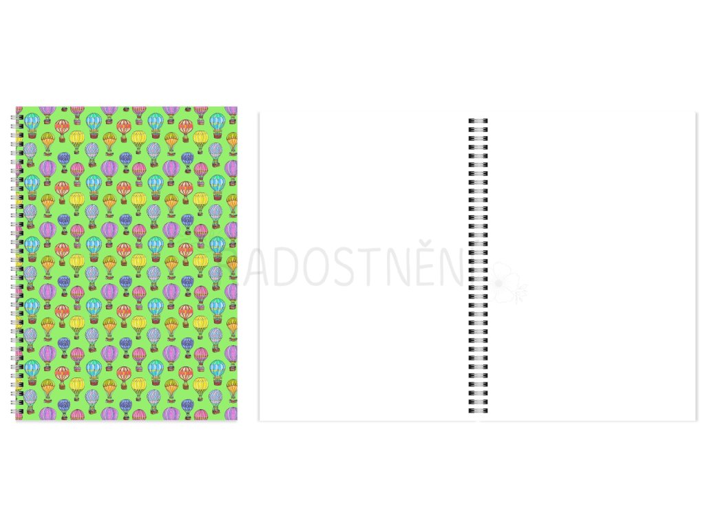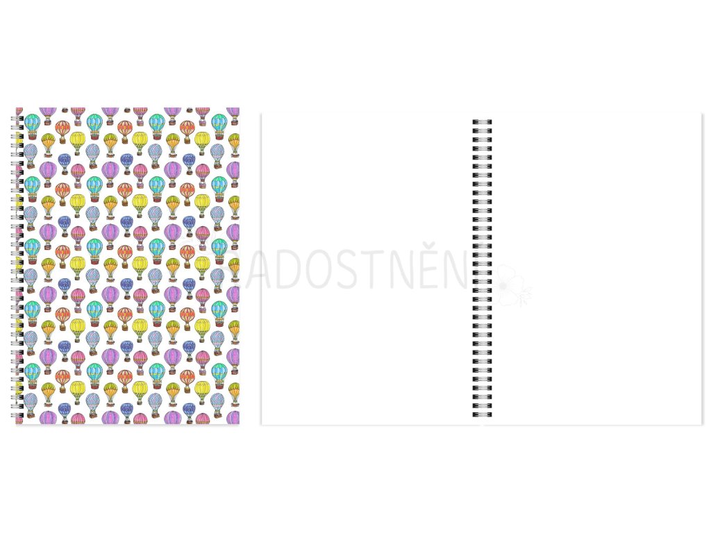 Ručně vyráběný sešit s kroužkovou vazbou s autorským motivem létajících balonů.