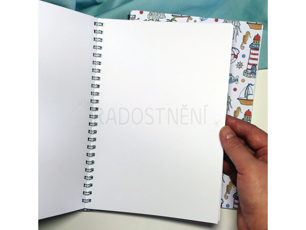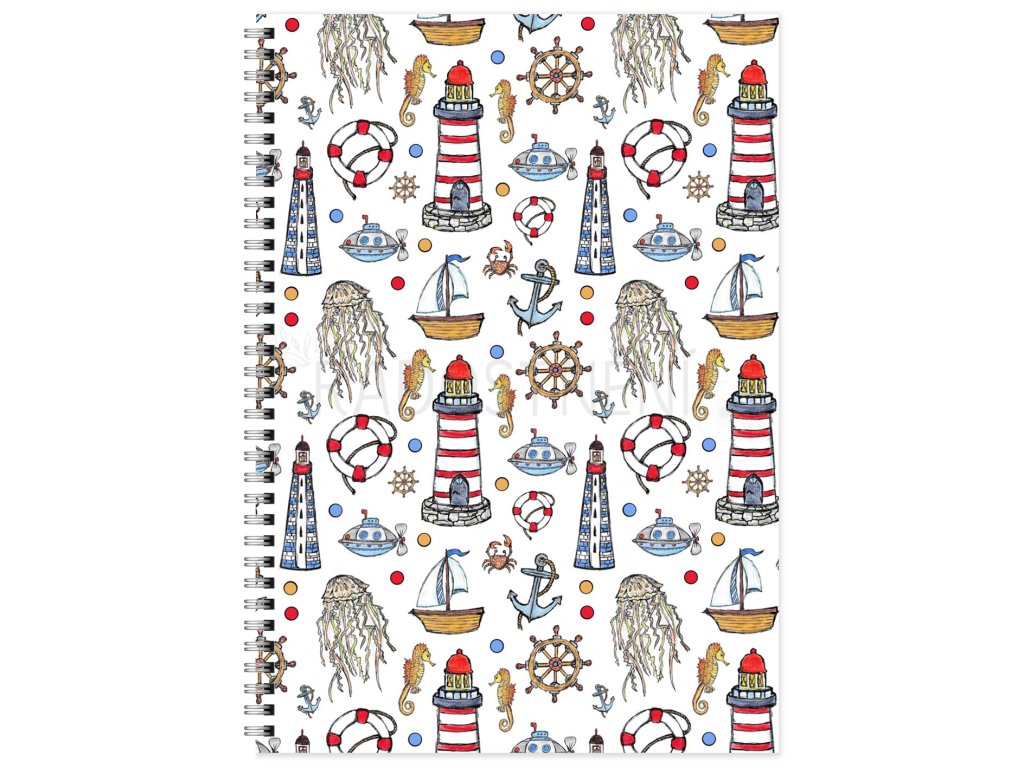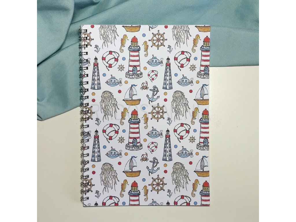 Ručně vyráběný sešit s kroužkovou vazbou s autorským motivem námořnického léta.