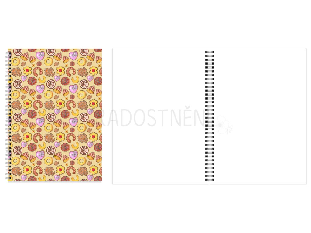 Ručně vyráběný sešit s kroužkovou vazbou s autorským motivem vánočního cukroví.